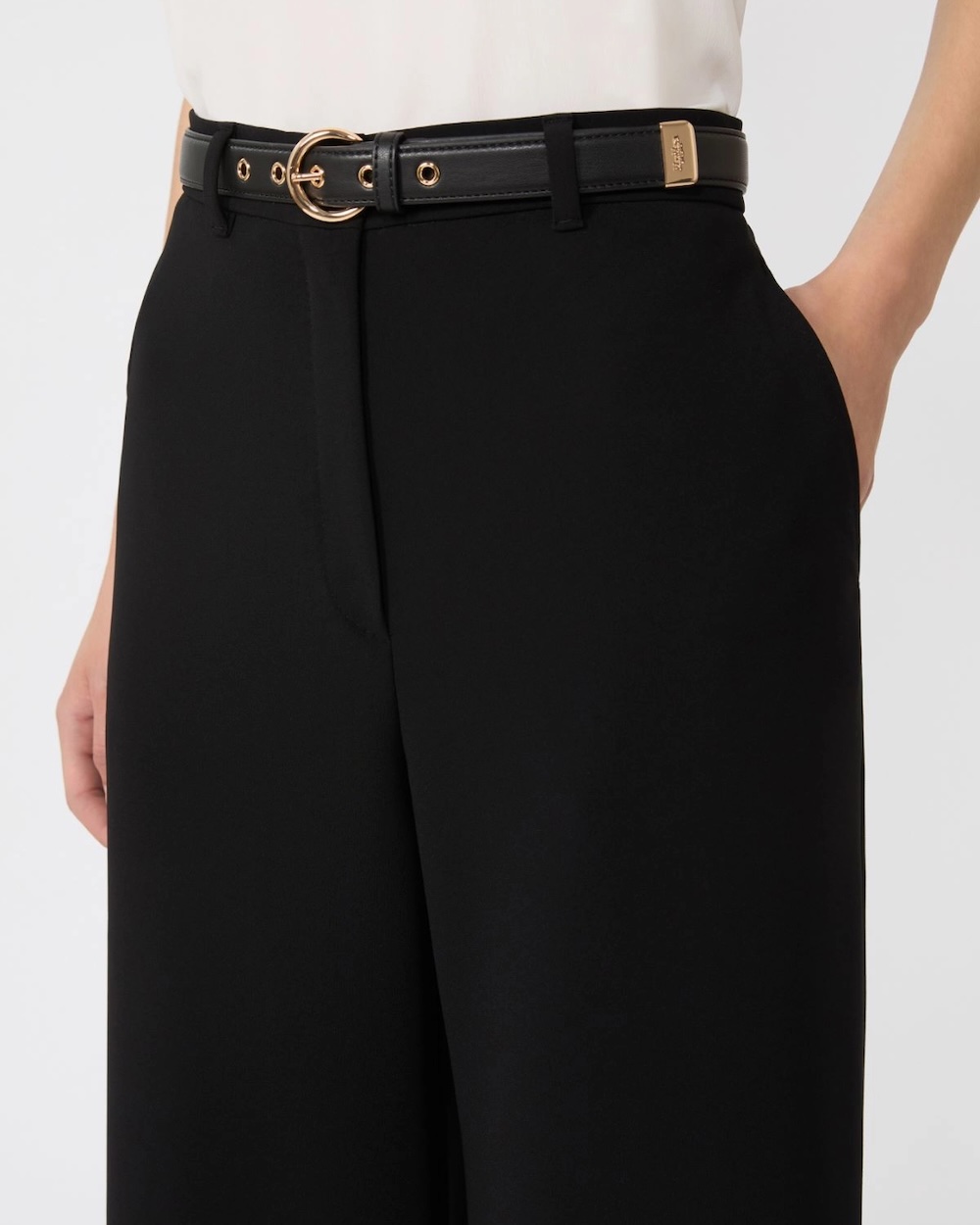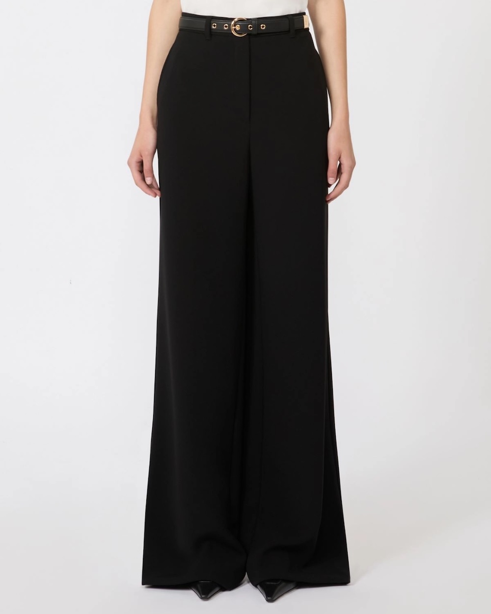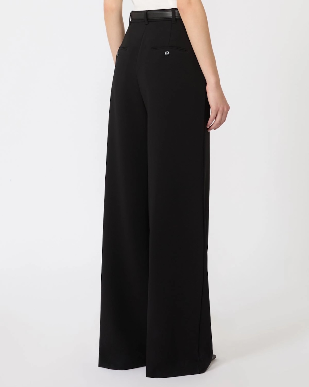 Calças em cady com perna larga e silhueta de cintura média-alta, perfeitas para criar um look elegante, alongado e contemporâneo. O corte fluido cai de forma impecável, enquanto a cintura estruturada valoriza a linha do corpo sem esforço. Fecham com zip oculto, pala e gancho, e incluem bolsos laterais oblíquos e bolsos traseiros de duplo debrum com botão, num acabamento claramente sartorial. Têm presilhas e pinças traseiras para um ajuste mais bonito e são acompanhadas por um cinto a condizer em napa, com fivela circular, que permite marcar a cintura e completar o look com um detalhe sofisticado.