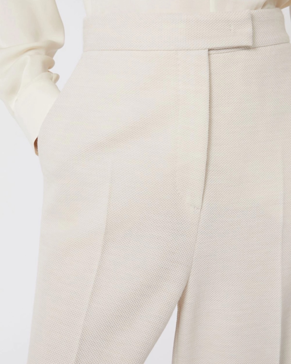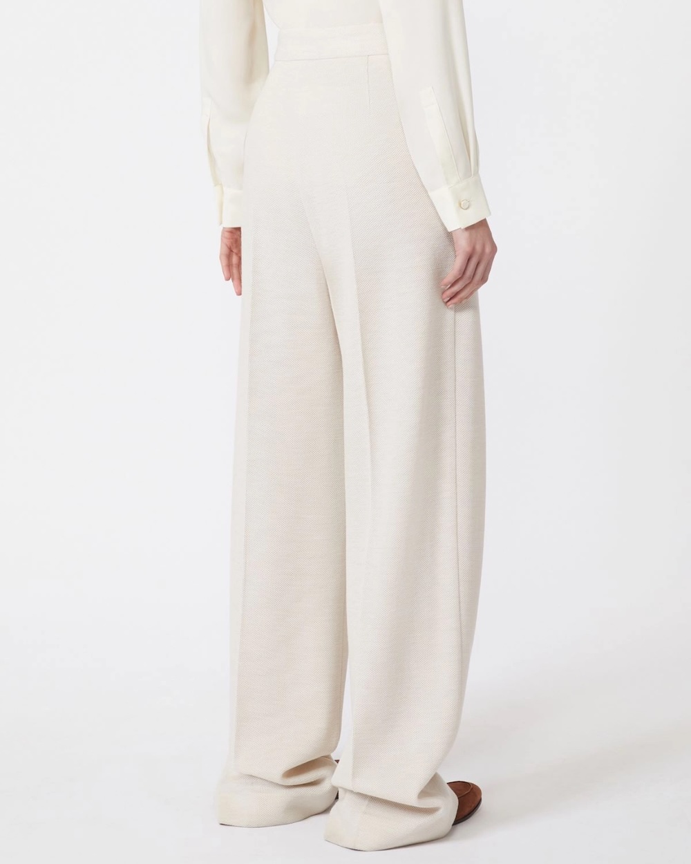Calças de cintura subida, confecionadas em malha piqué de lã virgem, com perna larga e linha elegante que alonga a silhueta. Uma peça de alfaiataria contemporânea, onde estrutura e conforto convivem naturalmente.