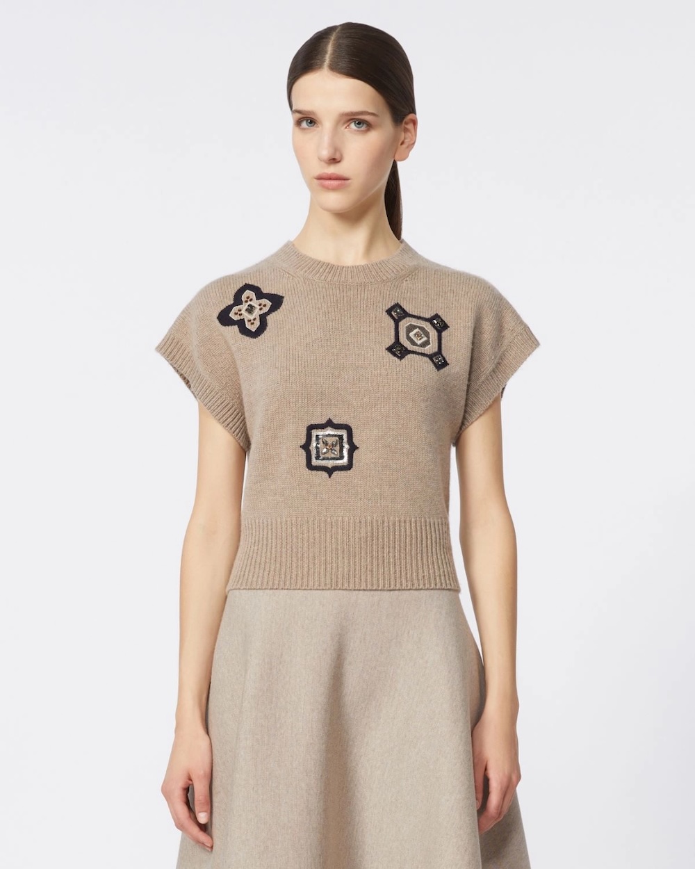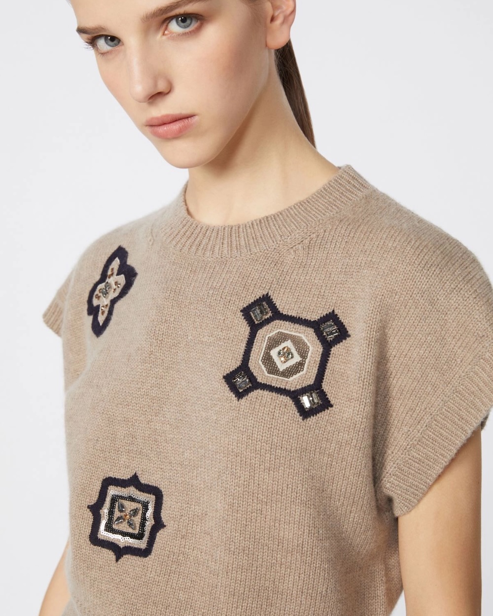 Camisola curta em mistura de lã e caxemira, com aplicações bordadas de lantejoulas e strass, que acrescentam luminosidade subtil e um toque sofisticado à peça.