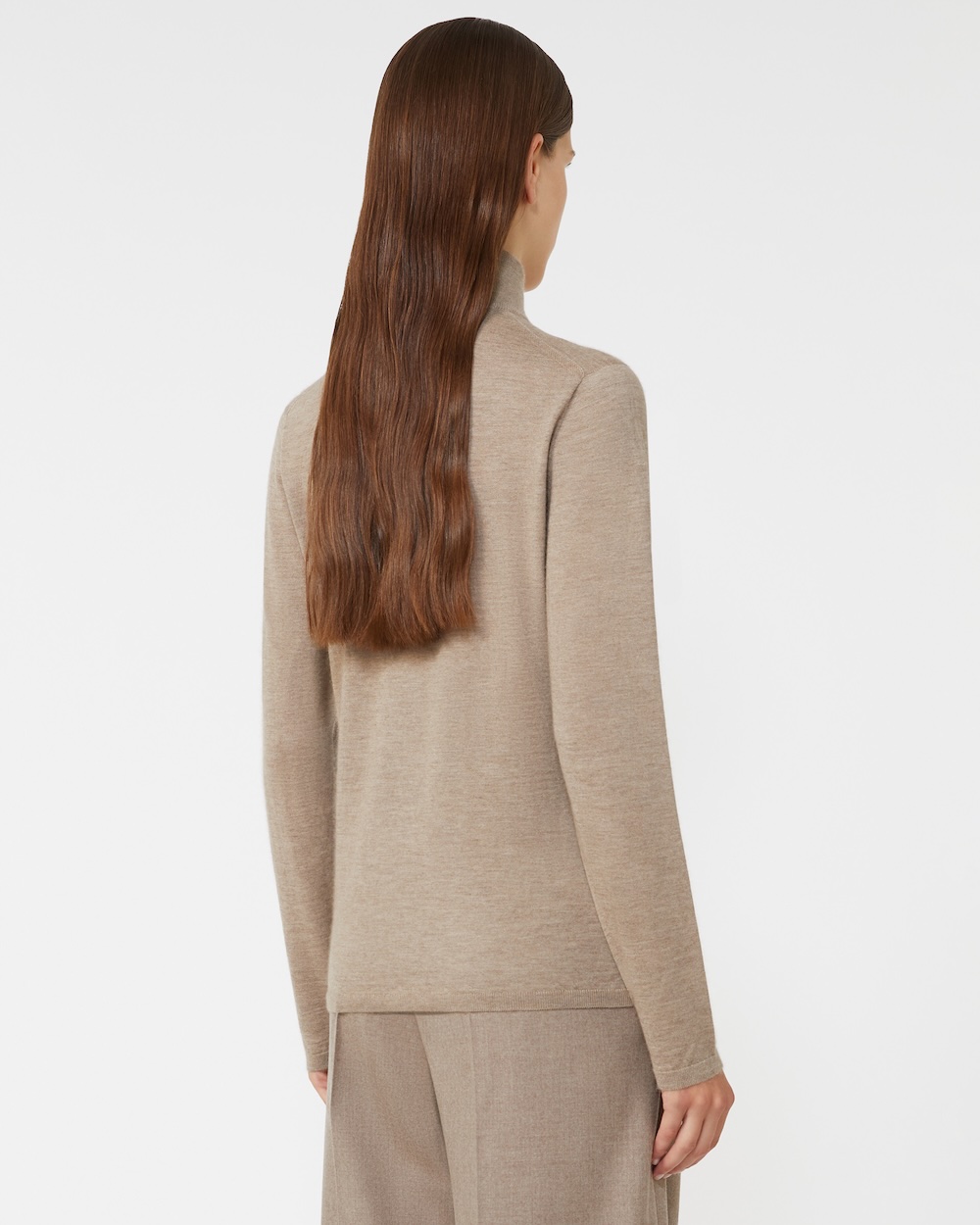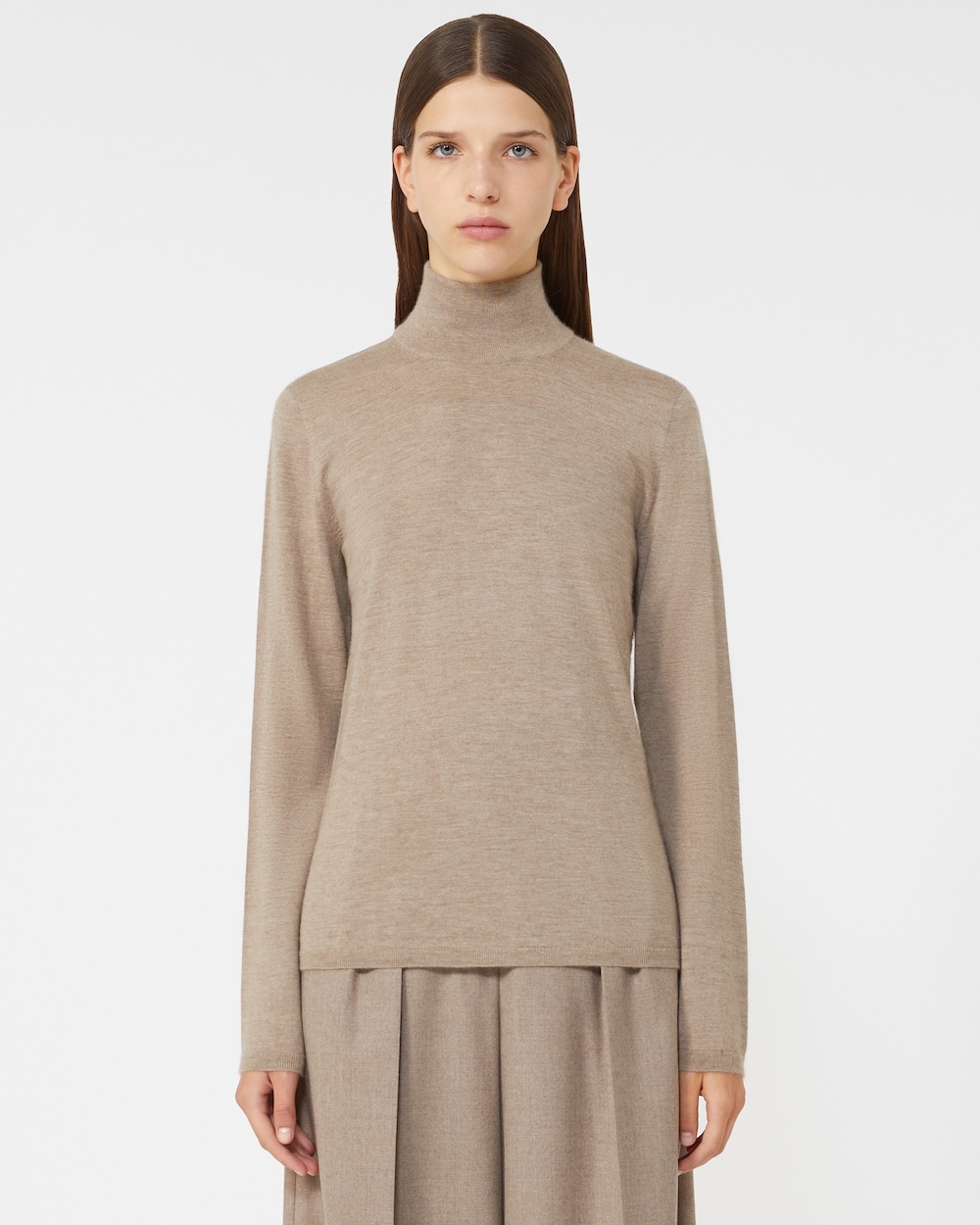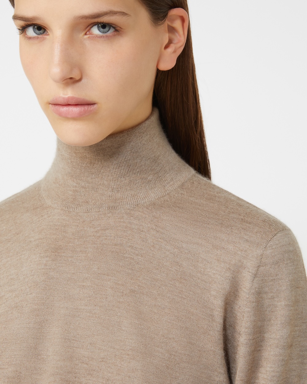 Camisola de gola alta com estrutura sem costuras que garante um ajuste confortável e aconchegante. A camisola leve, em malha lisa de caxemira pura, com caimento regular tem a gola alta canelada, mangas compridas embutidas, bainha reta e punhos e bainha canelados.
