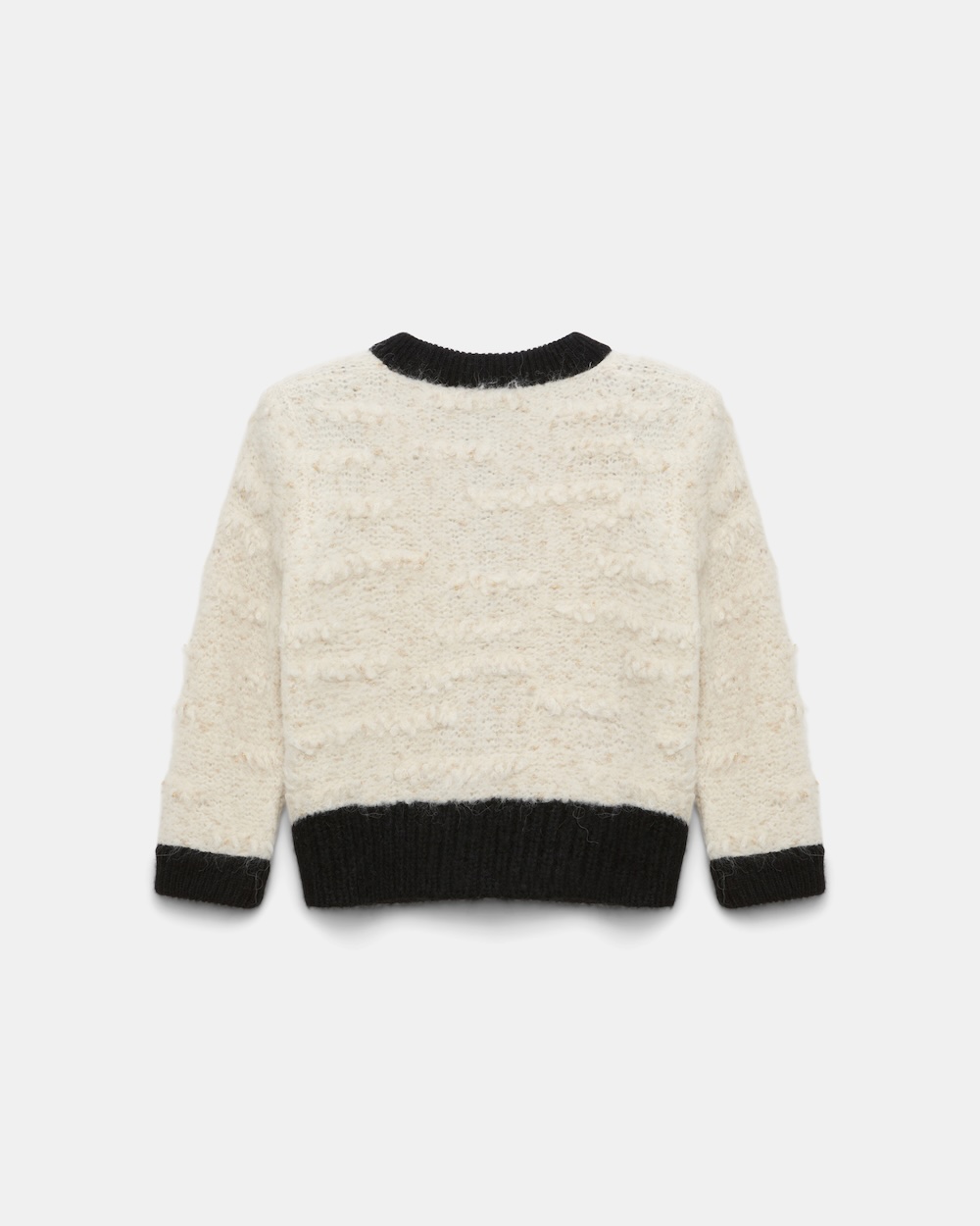 O casaco bicolor é tricotado numa mistura de lã de alpaca com brilho Lurex e lã Merino lisa. O corte reto tem um toque semelhante ao bouclé e botões dourados em forma de rosa D.