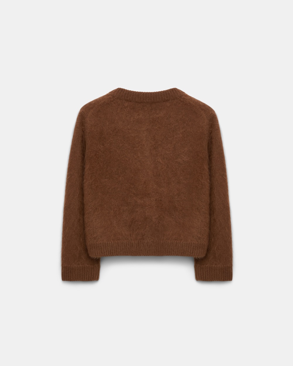 A palavra que vem à cabeça é aconchego: o cardigan tem gola redonda e é tricotado numa mistura macia de caxemira e lã merina. A lavagem felpuda confere ao modelo cropped e estruturado um toque extra de suavidade.