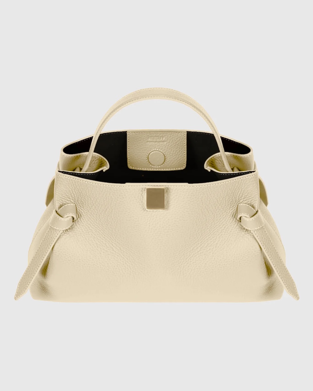 A Gyoza é uma mala estruturada com alça superior, confecionada em luxuoso couro italiano com textura granulada e adornada com elegantes detalhes em metal dourado.