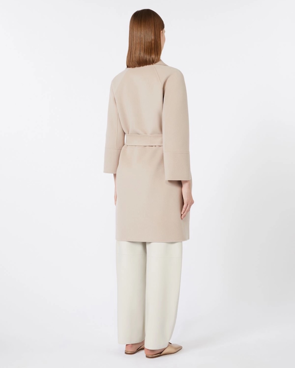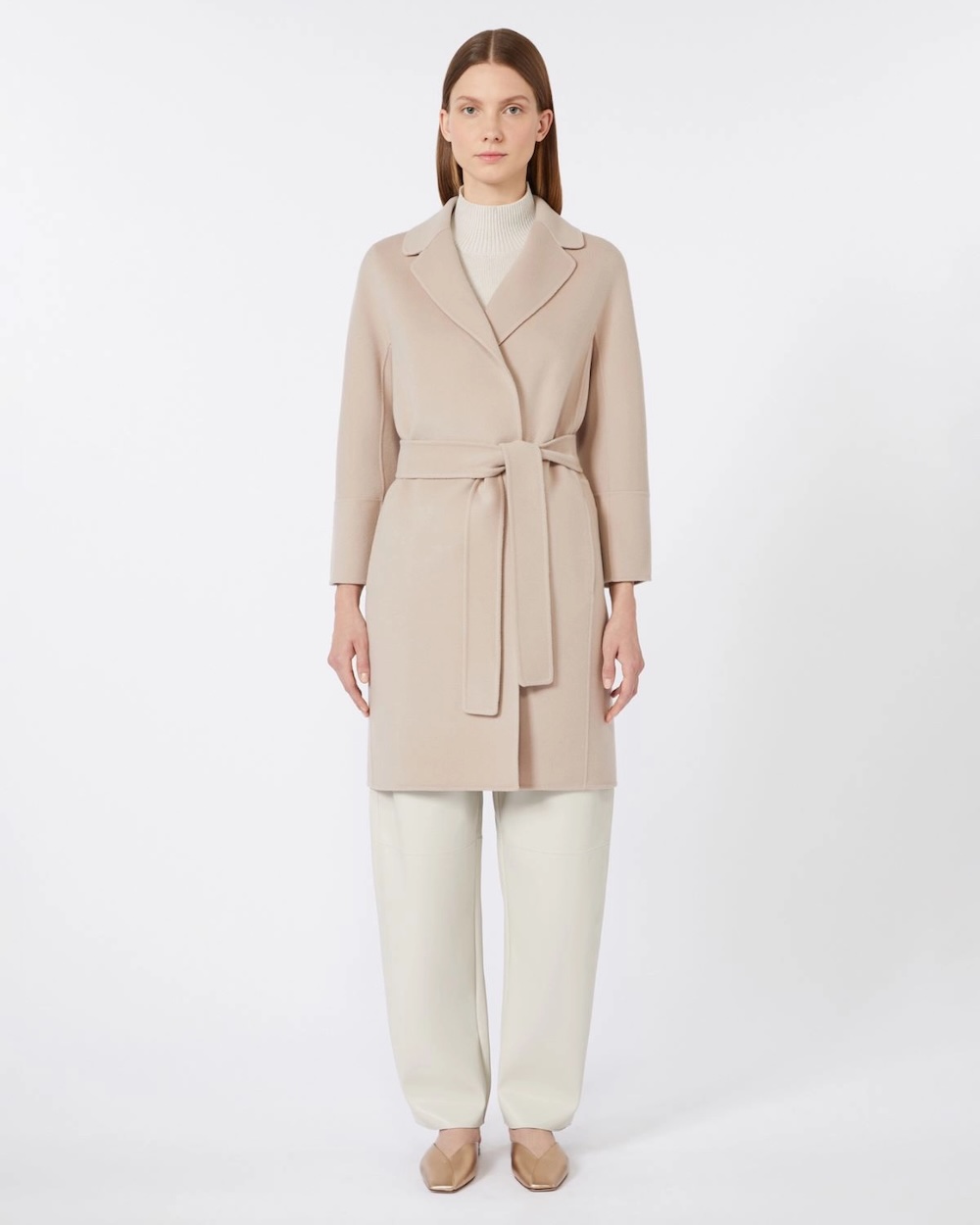 Casaco curto com corte casulo e cintura marcada com pences nas costas.