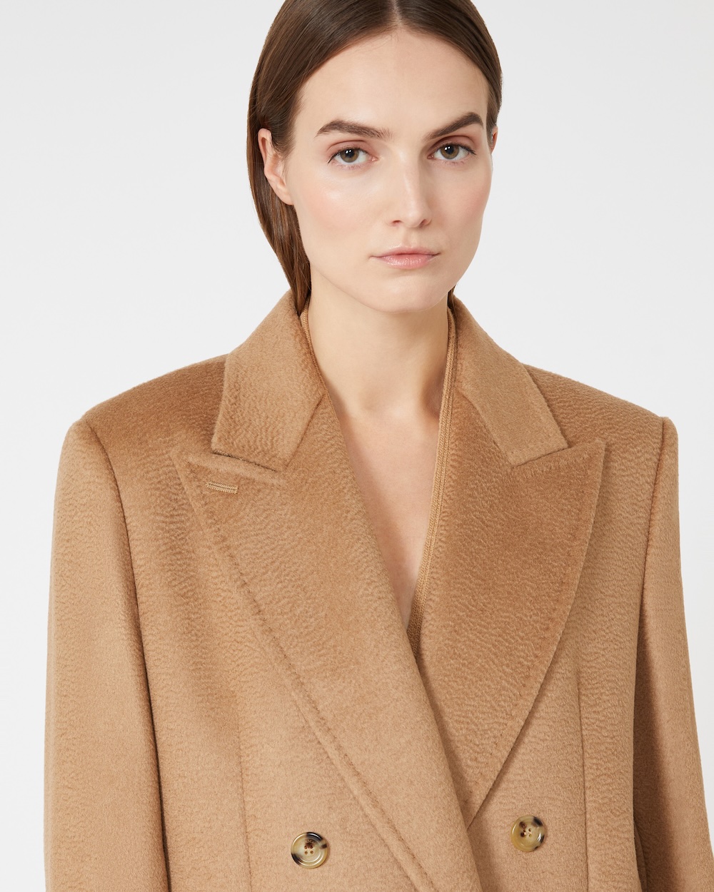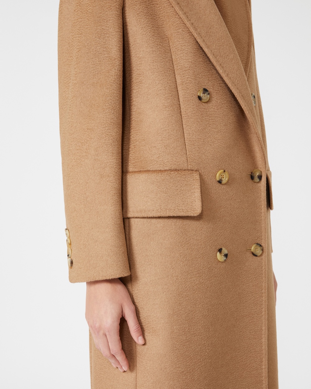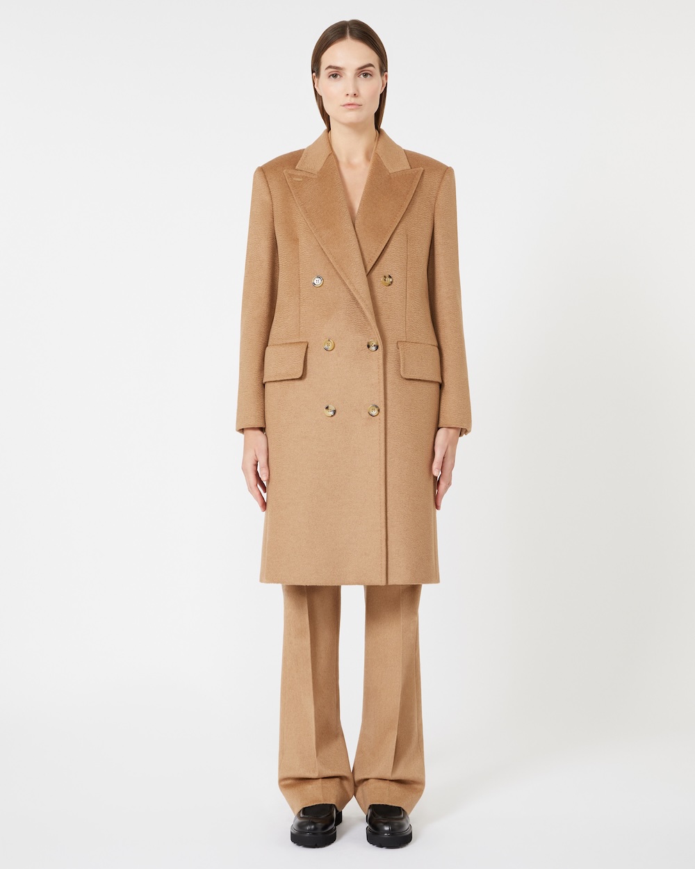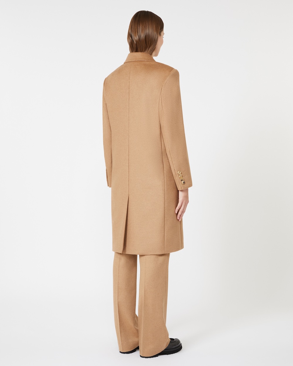Casaco largo com racha central nas costas. O casaco drapeado, feito em zibelina de pura lã de camelo, apresenta linhas retas com ombros ligeiramente estruturados, lapelas pontiagudas e mangas embutidas com punhos abotoados, fecho trespassado com seis botões, bolsos com abas na frente. O modelo é embelezado com pesponto de regulação e é forrado.