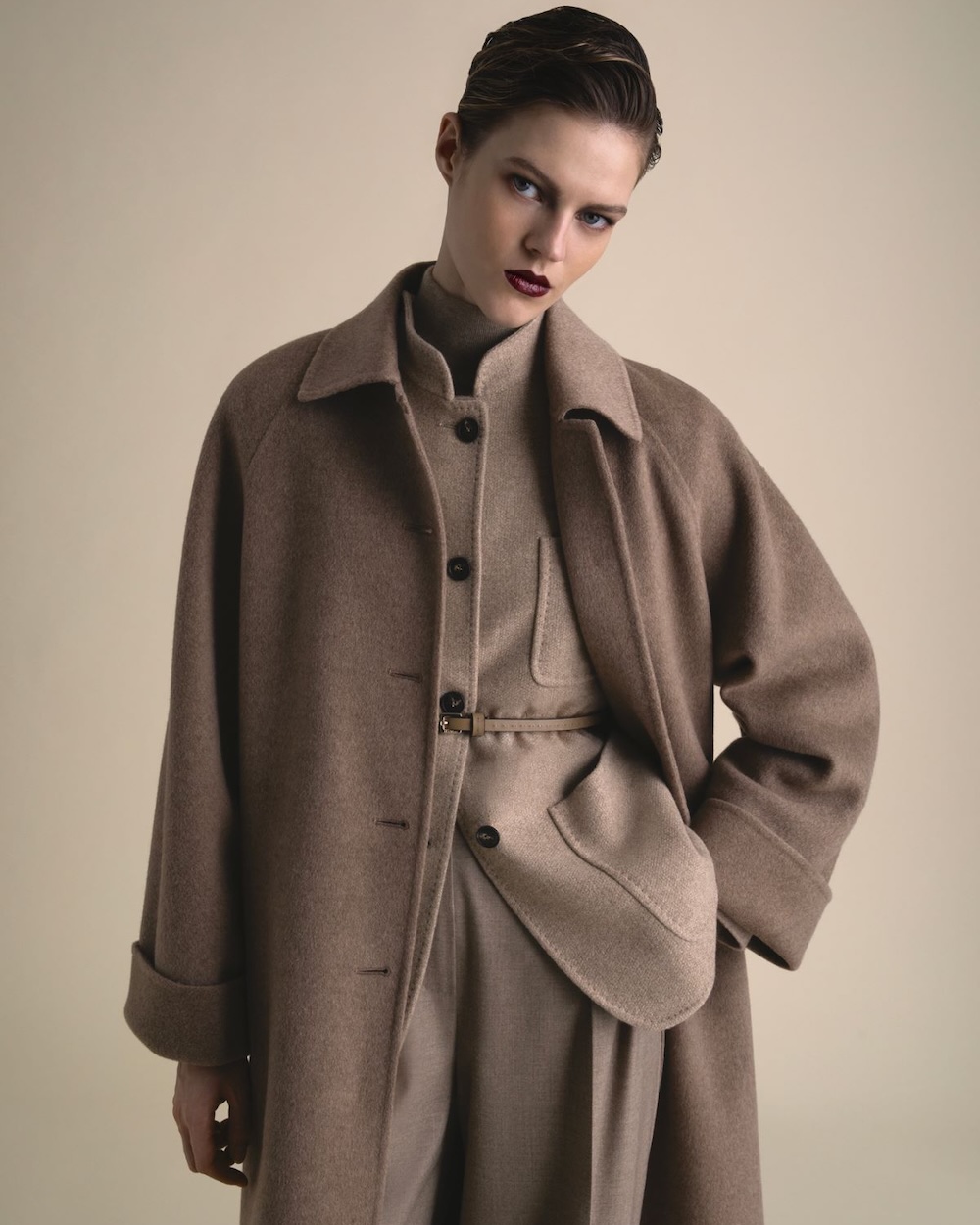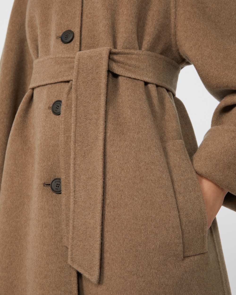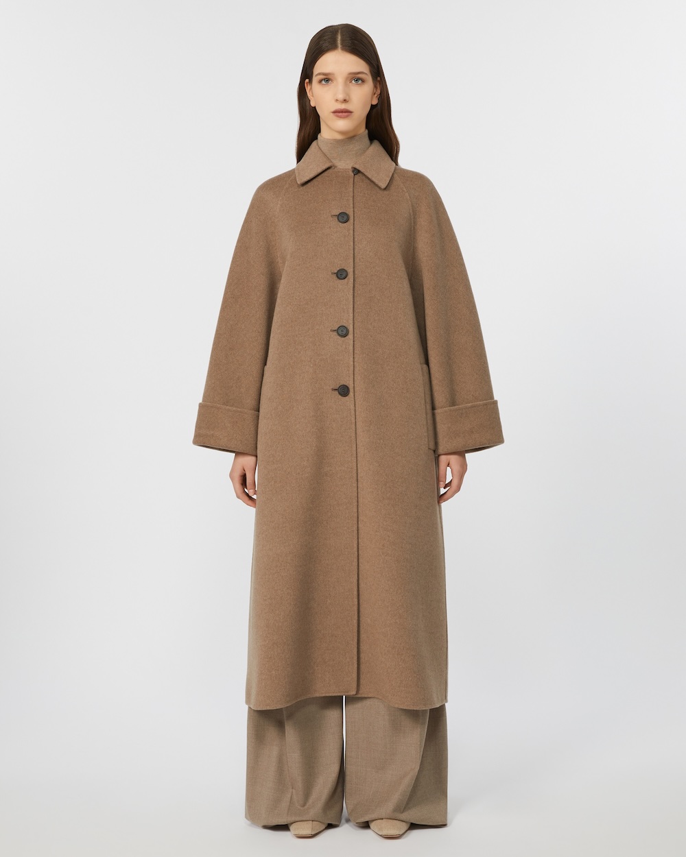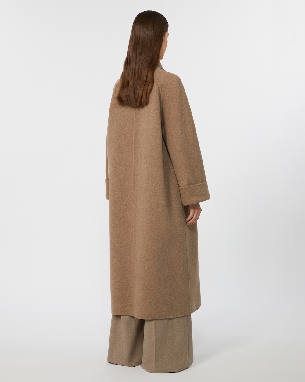 Casaco comprido e oversized com cinto a condizer para atar na cintura. O casaco drapeado é feito em dupla face de caxemira pura e macia e costurada à mão. Apresenta gola tipo camisa com botão e ilhós, mangas raglan compridas e volumosas, fecho simples com botões visíveis e bolsos verticais embutidos nas laterais. Sem forro.