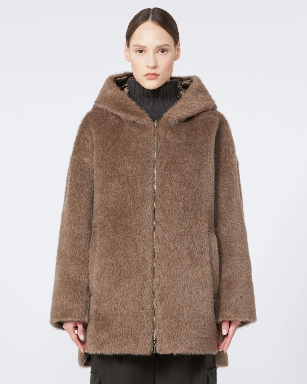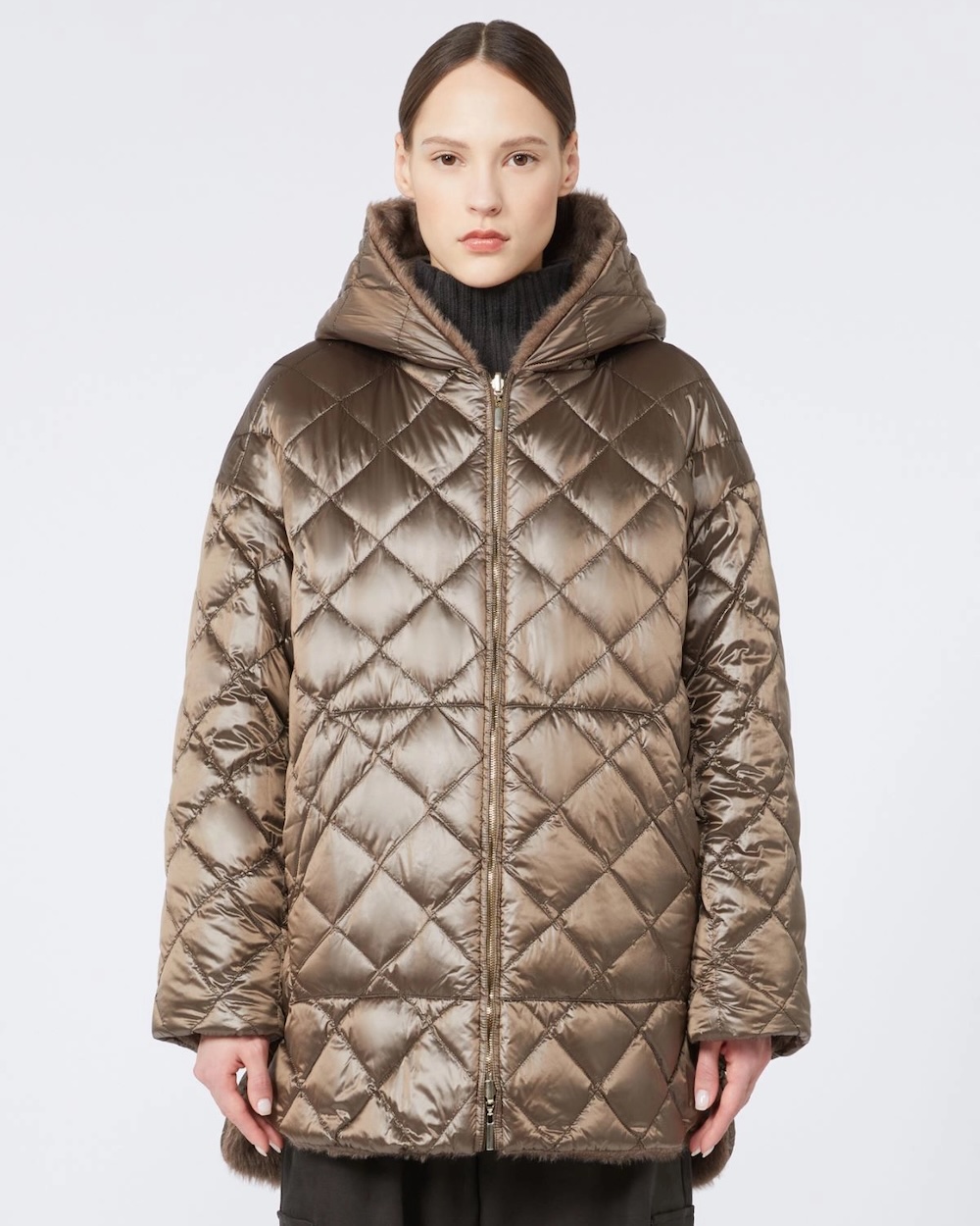 Casaco acolchoado de comprimento médio, reversível, com uma silhueta limpa e reta e um baixo arredondado ligeiramente mais longo atrás. Um lado apresenta um tecido rico em alpaca e lã, de toque suave e luxuoso; o outro revela um nylon acolchoado em padrão losangular, repelente à água — dois moods numa só peça.