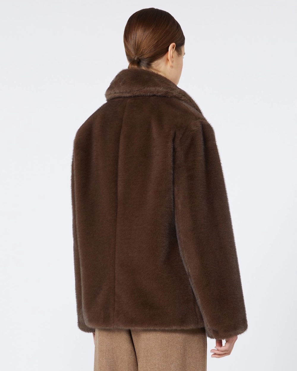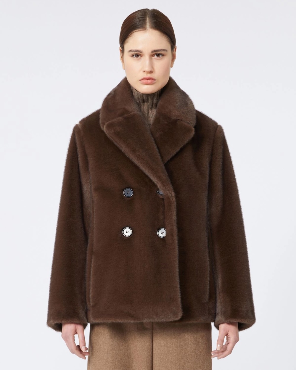 Casaco em pelo sintético, duplo abotoamento e corte ligeiramente curto que envolve a silhueta com suavidade. A gola de lapela sublinha o carácter sofisticado da peça, enquanto as mangas compridas e os bolsos inseridos nas laterais mantêm a funcionalidade. Fecho frontal visível com botões de corno e interior totalmente forrado, garantindo conforto e estrutura.