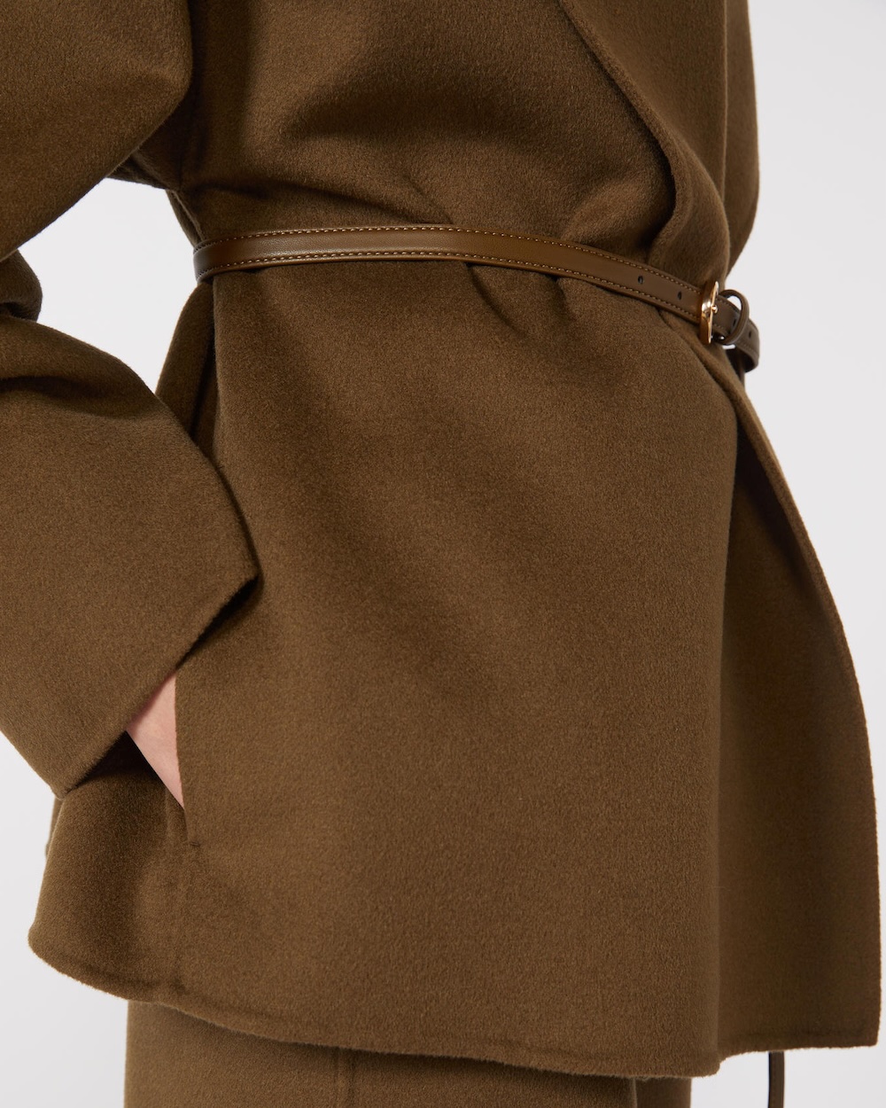 Casaco curto estilo envelope com cinto a condizer para acentuar a cintura.