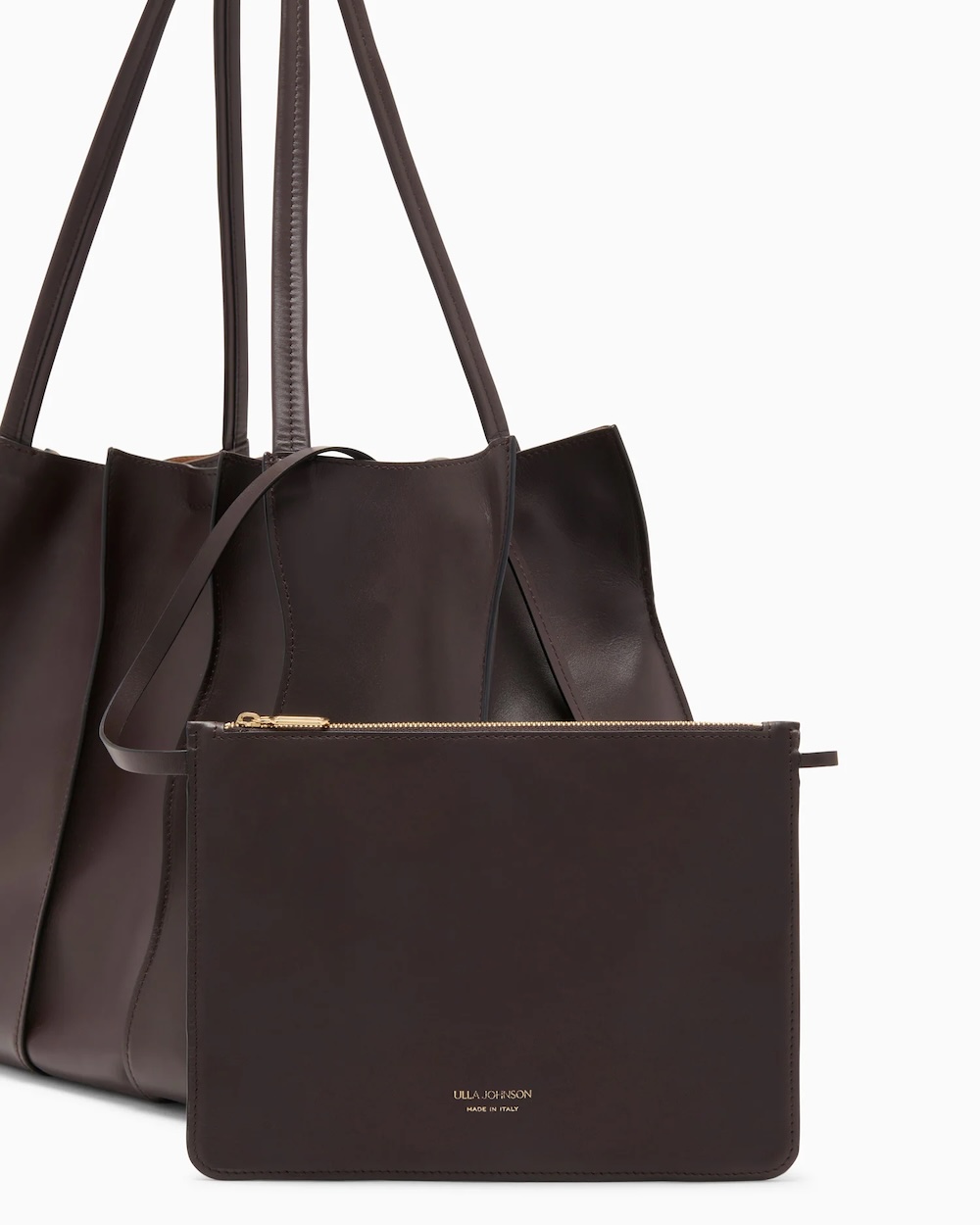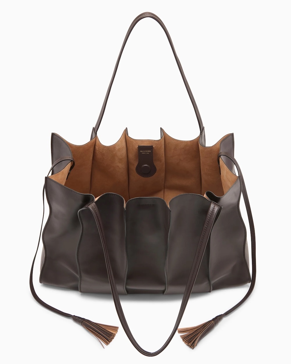 Repaginada como uma bolsa espaçosa, a Adria é feita em Itália com painéis de couro ondulado costurados e adornados com bordas pintadas, realçando as ondas esculturais. Concebida com a funcionalidade em mente, esta mala de ombro castanho-escura tem alças acolchoadas para conforto durante todo o dia e não tem forro para ser mais leve. Os laços internos com borlas enroladas à mão completam este item essencial para o dia a dia.