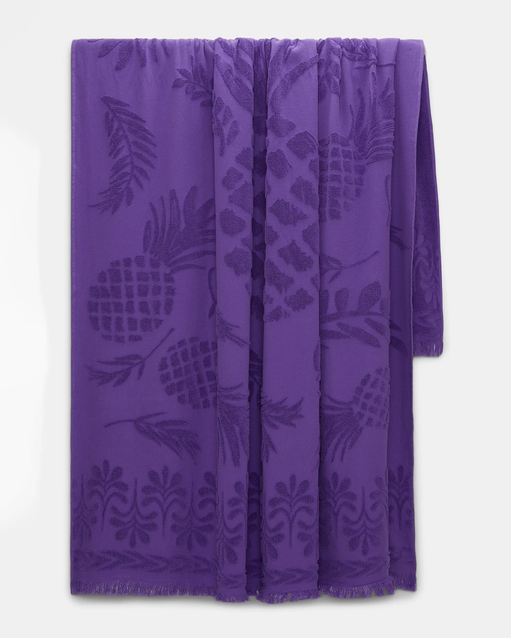 A grande toalha de algodão tem bainhas com franjas e é uma peça tingida unidade a unidade. A toalha tem estampado jacquard de abacaxi, desenvolvido pela marca. Tamanho: 140cm x 220cm.