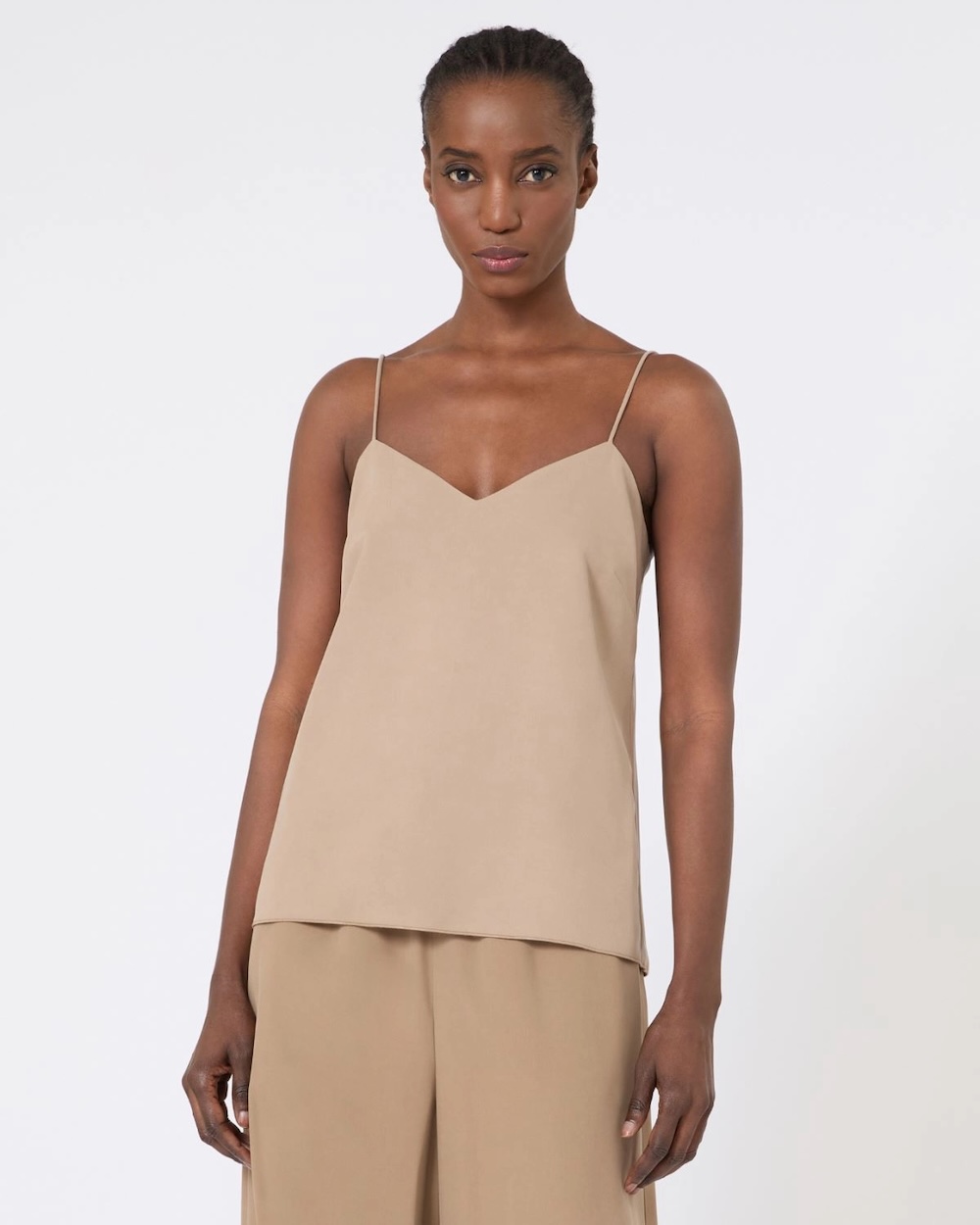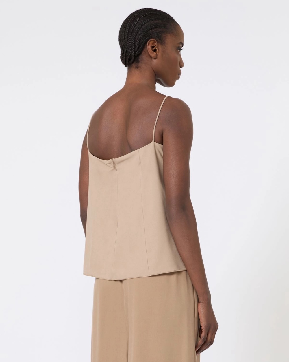 Top sem mangas em tela de seda pura, com acabamento lavado que lhe confere um toque suave e um cair naturalmente elegante. Inspirado no universo da lingerie, é uma peça delicada, feminina e extremamente versátil.